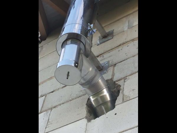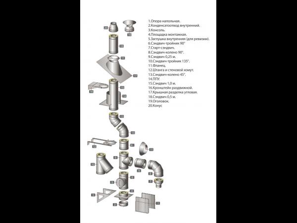 Двустенный дымоход или сэндвич представляет собой конструкцию, которая состоит из двух наделенных разными диаметрами труб (внешней и внутренней). Пространство между этими трубами наполнено теплоизоляционным материалом негорючего свойства из базальтового волокна высокого качества. За счет такой конструкции происходит быстрый нагрев внутренней трубы, что впоследствии дает возможность за короткий промежуток времени после старта поднять температуру в дымоходе выше «точки росы», тем самым избежав образования конденсата.
